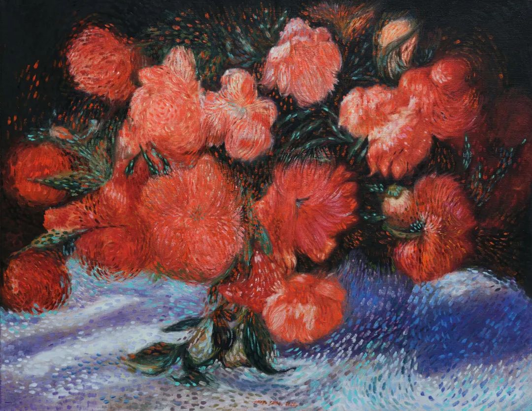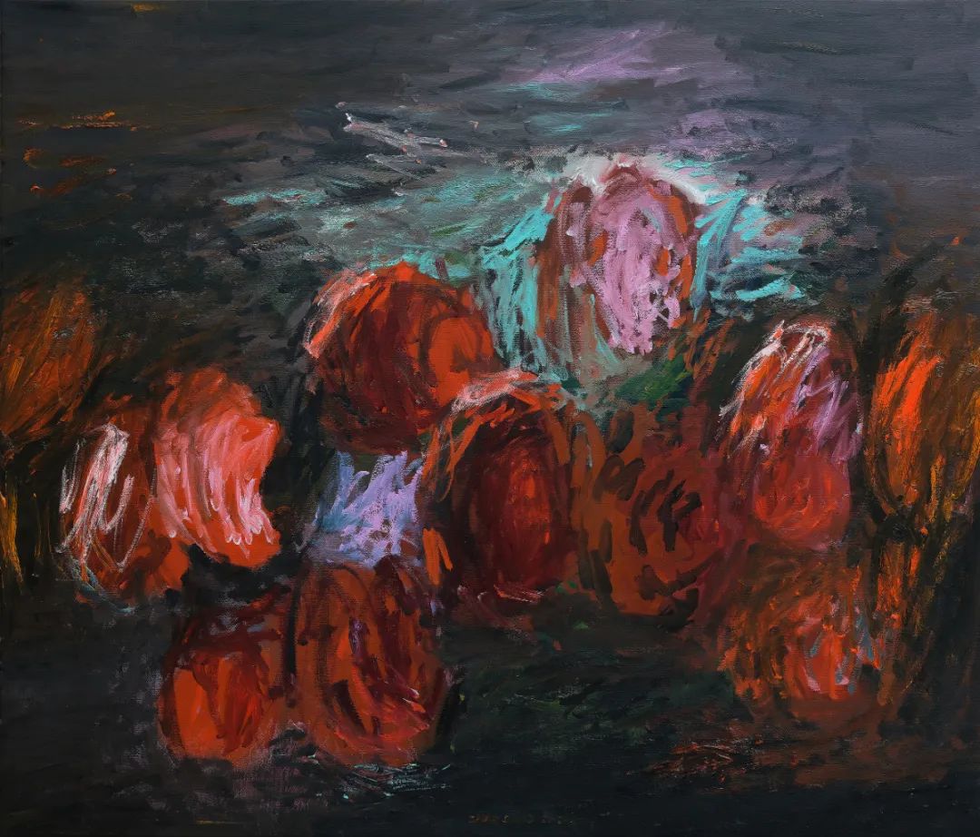 「微观下的花团锦簇」、「暗色背景的鲜红花束」是赵赵此次作品中常见的元素。画面上明亮缤纷的鲜花、姿态各异的红花以及环绕其间的种子,与幽深的背景形成鲜明对比,引导观者视线在物象间来回穿梭。除此之外,艺术家笔下原本可辨识的草木轮廓,逐渐堆叠成形态模糊、颜色灰暗的色块。通过看似随意洒脱的笔触将物象转为抽象的符号,刻画出万物的枯荣变化,并揭示潜藏于「菩提」下「无常」的象征——色即是空。