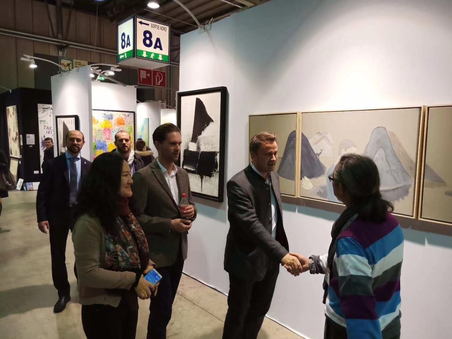 - 赵丽先与卢森堡首相格扎维埃·贝泰尔伉俪在自己展出的作品前。ZHAO Lixian und das Ehepaar Premierminister Xavier Bettel vor ihrer ausgestellten Arbeit.